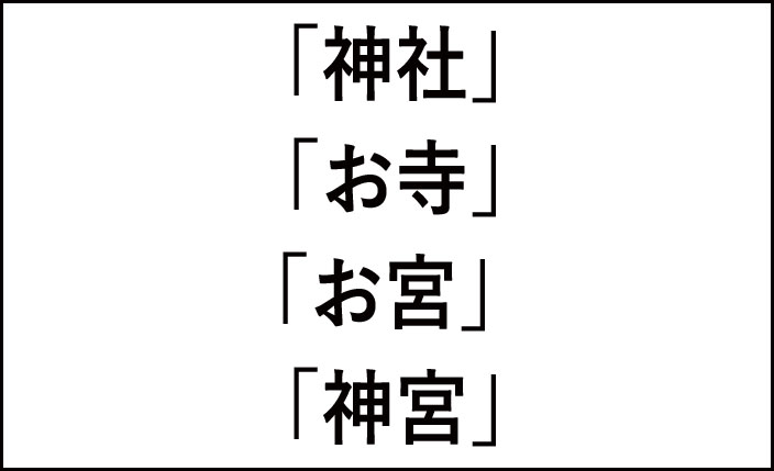 | 神宮 | 神道 | 皇室関連、高格式 | 神主・巫女 | 伊勢神宮 |
