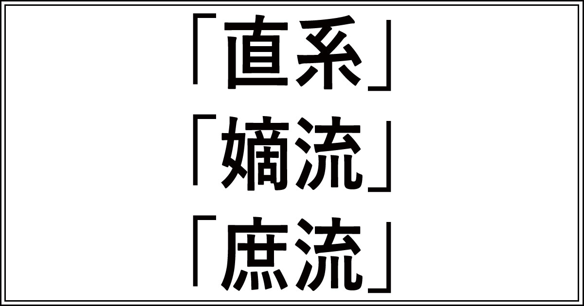 よくある間違いとして、「直系=嫡流」と思ってしまう人がいますが、これは誤用です。直系はもっと広い概念で、嫡流も庶流も含まれるんですね。