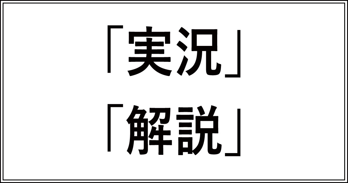 「実況」が現実に起きていることを伝える役割なのに対し、「解説」は起きたことの意味や、大事な点を分かりやすく説明する役割という点で、両者は明確に異なります。