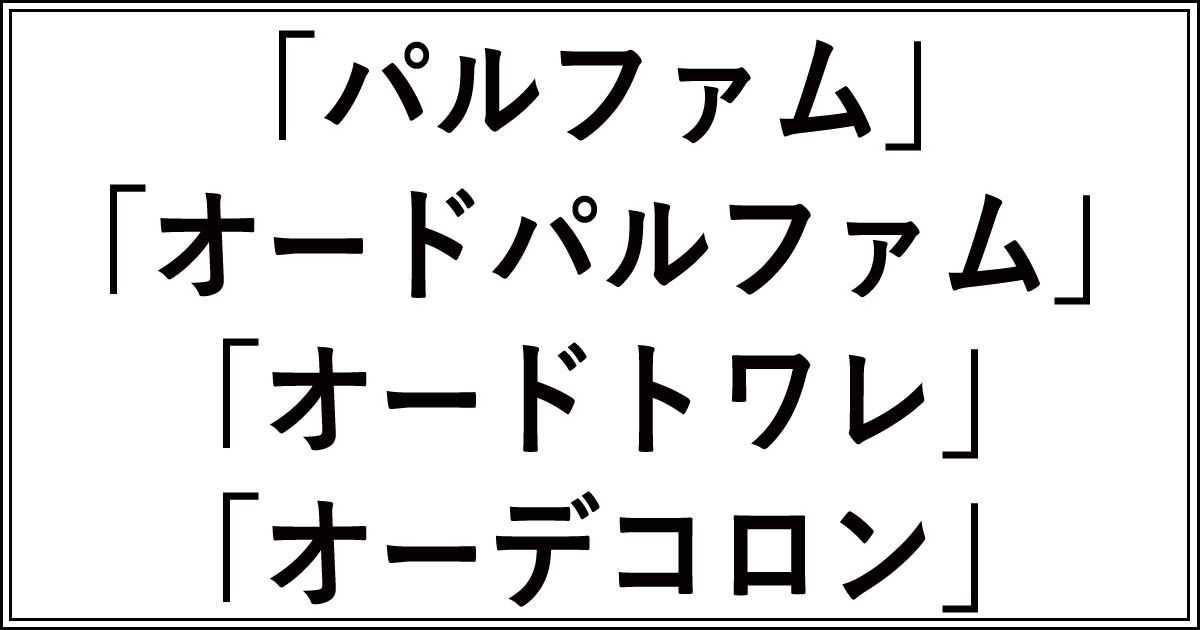 パルファム、オードパルファム、オードトワレ、オーデコロンの違いをまとめると以下の通りです:
