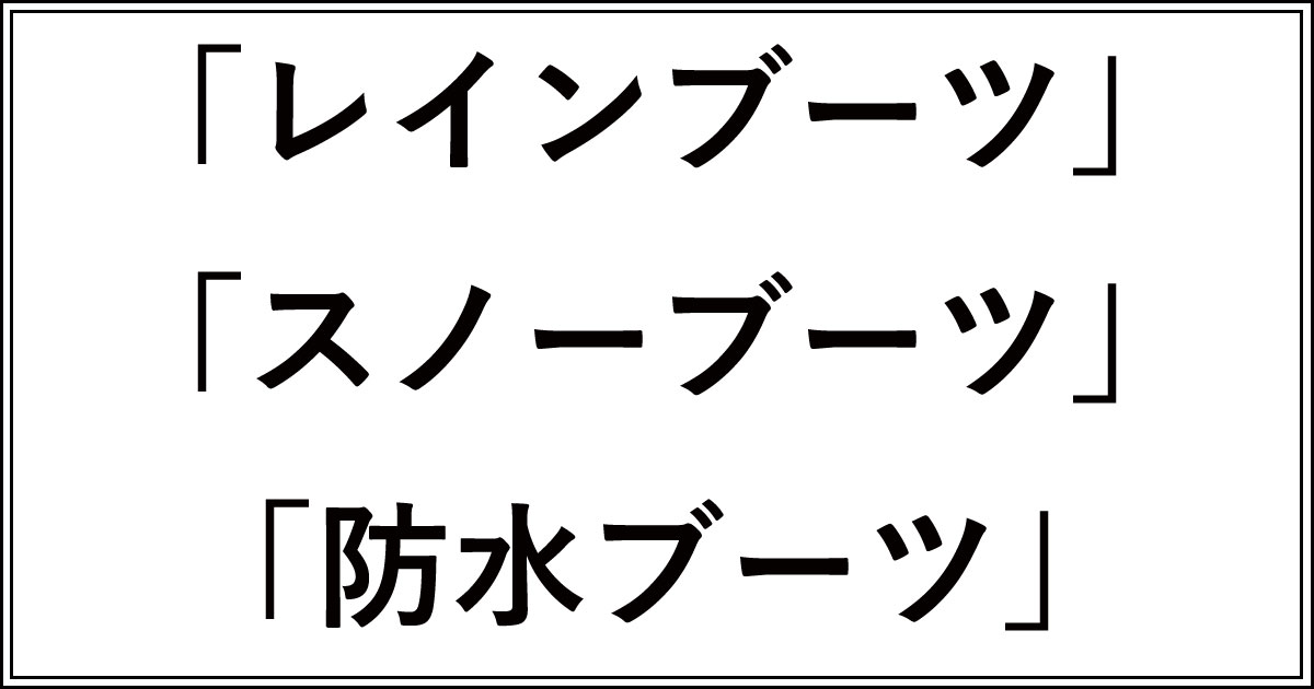 防水ブーツは、水を通さない加工が施されたブーツ全般を指す言葉です。つまり、レインブーツやスノーブーツも広い意味では防水ブーツの一種なんです。