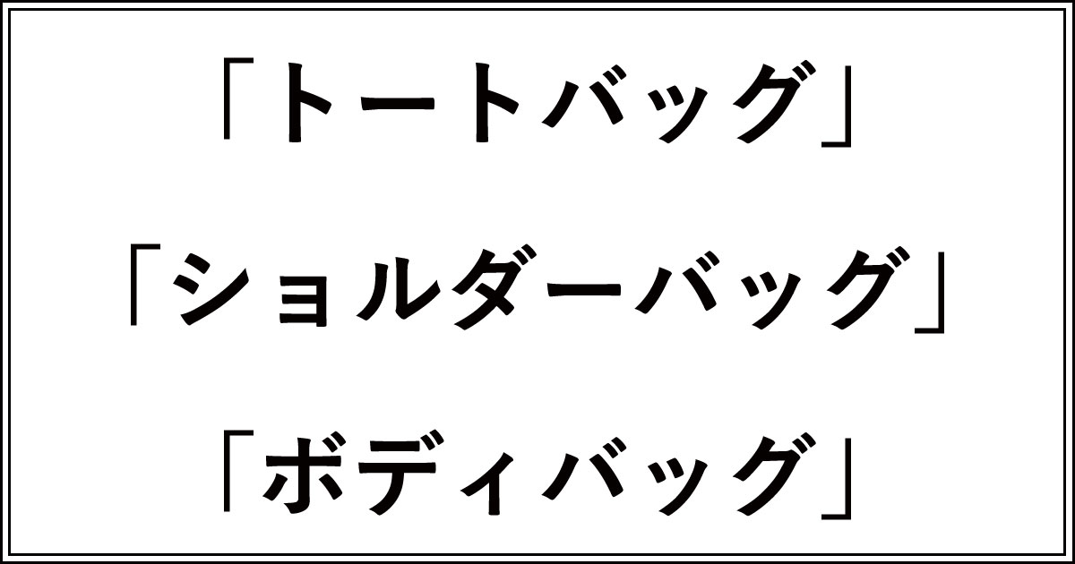 トートバッグ、ショルダーバッグ、ボディバッグの違いをまとめます。