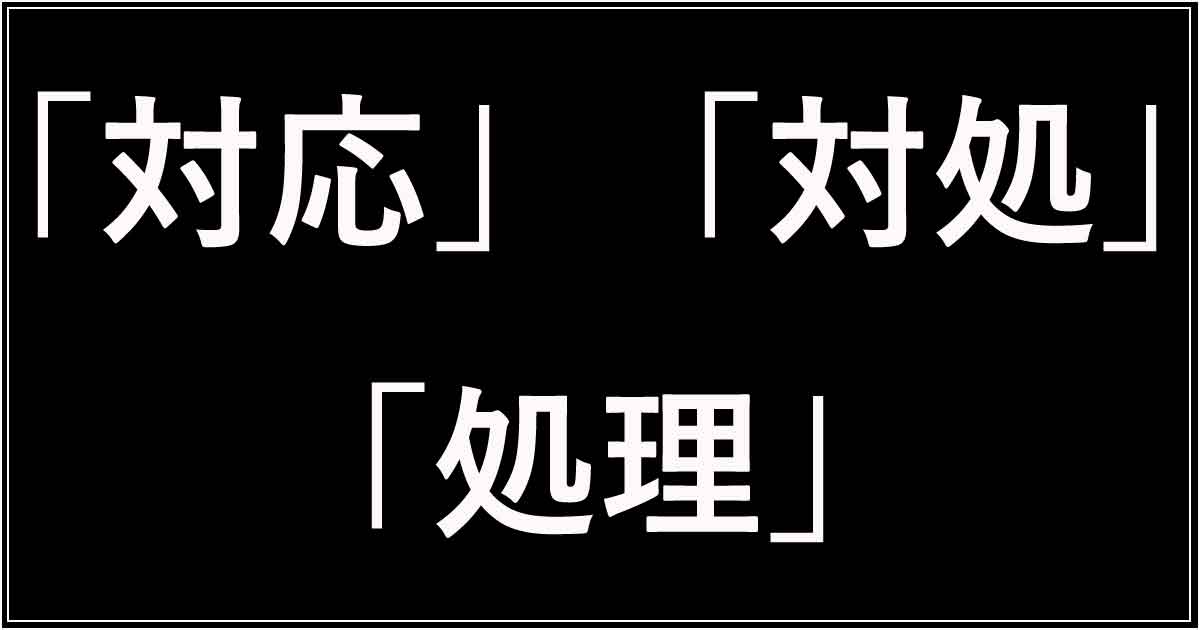 相手とのやり取りには「対応」、トラブル解決には「対処」、定型業務には「処理」を使います。「ご連絡いただいた件、対応いたします」「トラブルに対処いたしました」「書類処理を完了しました」というように使い分けます。