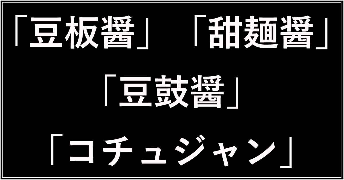 発祥地で判断する方法もあります。 中華料理なら豆板醤・甜麺醤・豆鼓醤、韓国料理ならコチュジャンです。