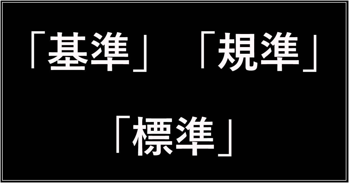 私の友人が品質管理をしていて、「基準は判断、規準は手本、標準は普通」と言っていました。製品検査では合格基準(数値)を設け、品質規準(目指すべき品質)に従い、標準仕様(一般的な構成)を作るそうです。それぞれ焦点が違うとか。
